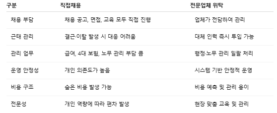 직접 채용은 초기 비용이 적게 느껴질 수 있지만, 장기적으로는 관리 부담과 운영 리스크가 누적되는 경우가 많습니다.